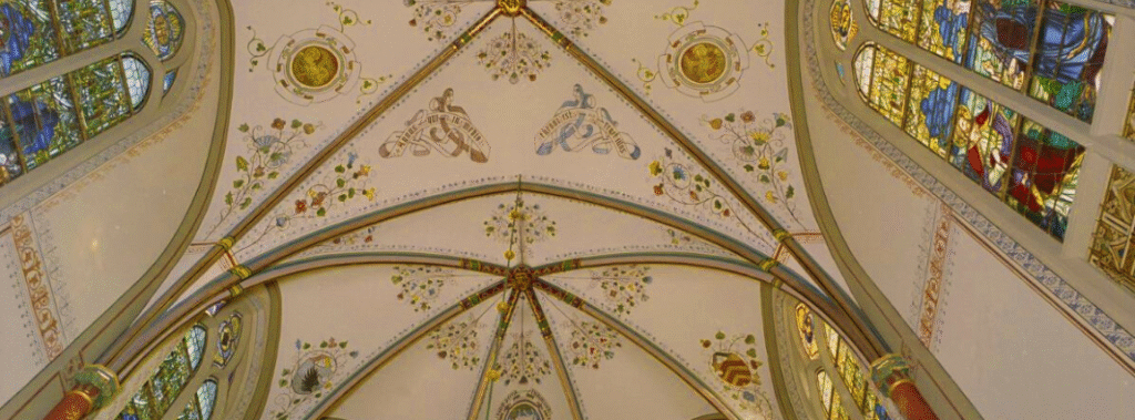 De Willibrorduskerk ligt sober en bescheiden aan de rand van het bos. Zodra je binnenkomt, wordt je verrast door de vele verfijnde details en de rijkdom aan kleur. Niet voor niets werd de kerk ooit uitgeroepen tot ‘mooiste kerk van Gelderland’.